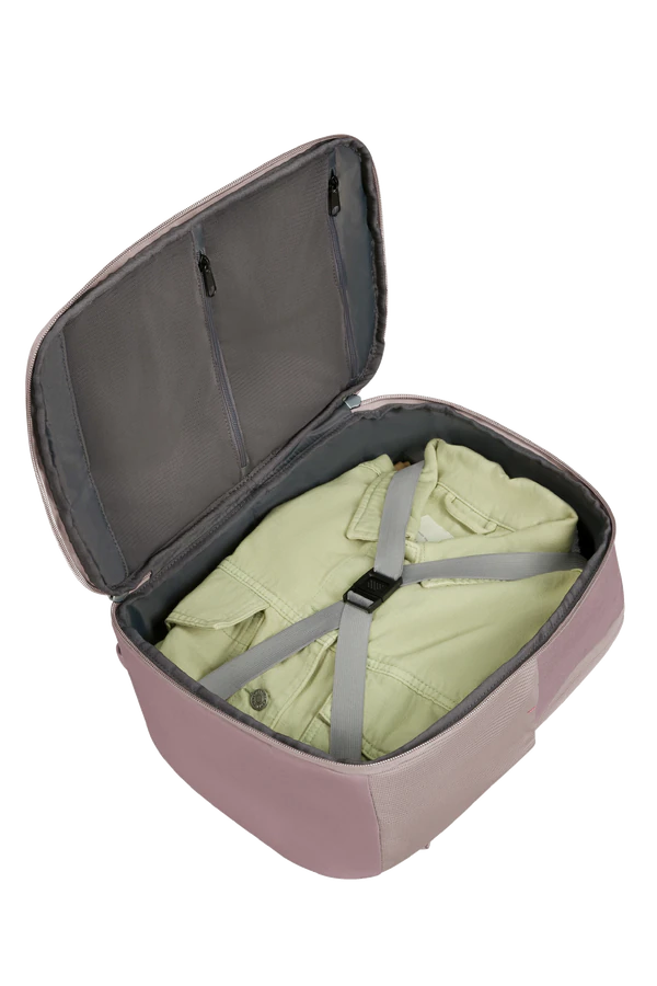 - Amplo, com cintas ajustáveis para melhor organização do vestuário e bolso em rede, See-Thru™.